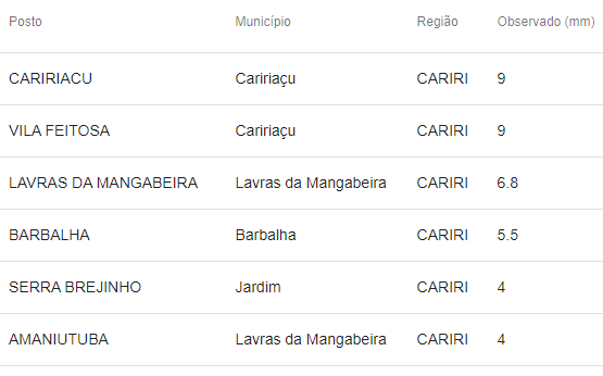 No Cariri, foram 27 municípios com precipitações, sendo a maior em Jati, 141,2 mm. Em Crato (52 mm), Juazeiro do Norte (9,5 mm) e Barbalha (5,5 mm), também houve precipitações. Confira onde choveu na região caririense de ontem para hoje:
